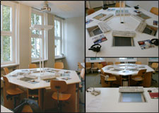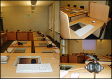 - ein Lehrerpult mit angeschlossener Tischkamera, Cassetten- und Videorecorder, CD- und DVD-Player, Video-Beamer